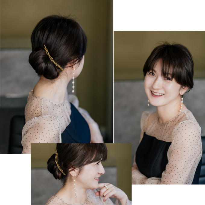 まとめ髪は老けるイメージがありましたが、このスタイルはエレガント且つ大人の余裕さえも感じてとても気に入りました。普段から女性らしいファッションが好きなので、いつもの私の雰囲気にも合いそう。練習して自分で簡単にできるようにしたいです。