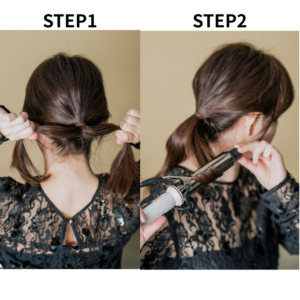 <STEP2>結んだ毛束はコテで内巻き・外巻きとランダムに軽く巻きますが、 毛先は外巻きで終わった方が可愛くてオススメ。仕上げにバレッタや眼鏡、大きめのピアスなどの小物で大人の遊び心をプラスすれば、グッとオシャレ感が出ますね。