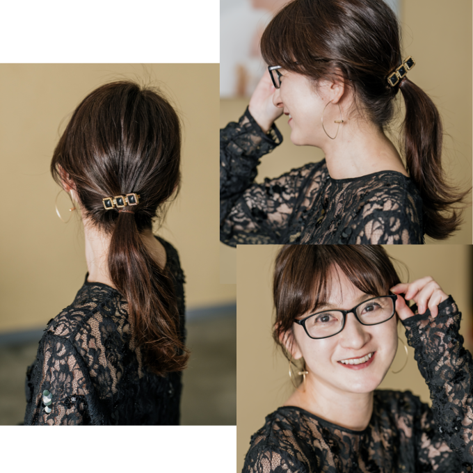 ② 簡単一つ結びヘアも、メガネ使い&バレッタで断然こなれる