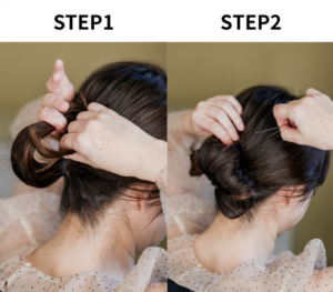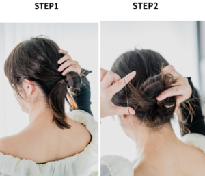 <STEP1>下めにお団子を作ります。お団子は小さいと老けた印象になるので、大きめのお団子できっちり結び、毛先から巻き込んでピンで固定。毛先からゴムに向かってくるくる巻き込んでいくと変形のお団子が出来るので、覚えておくとレパートリーが増えますよ。