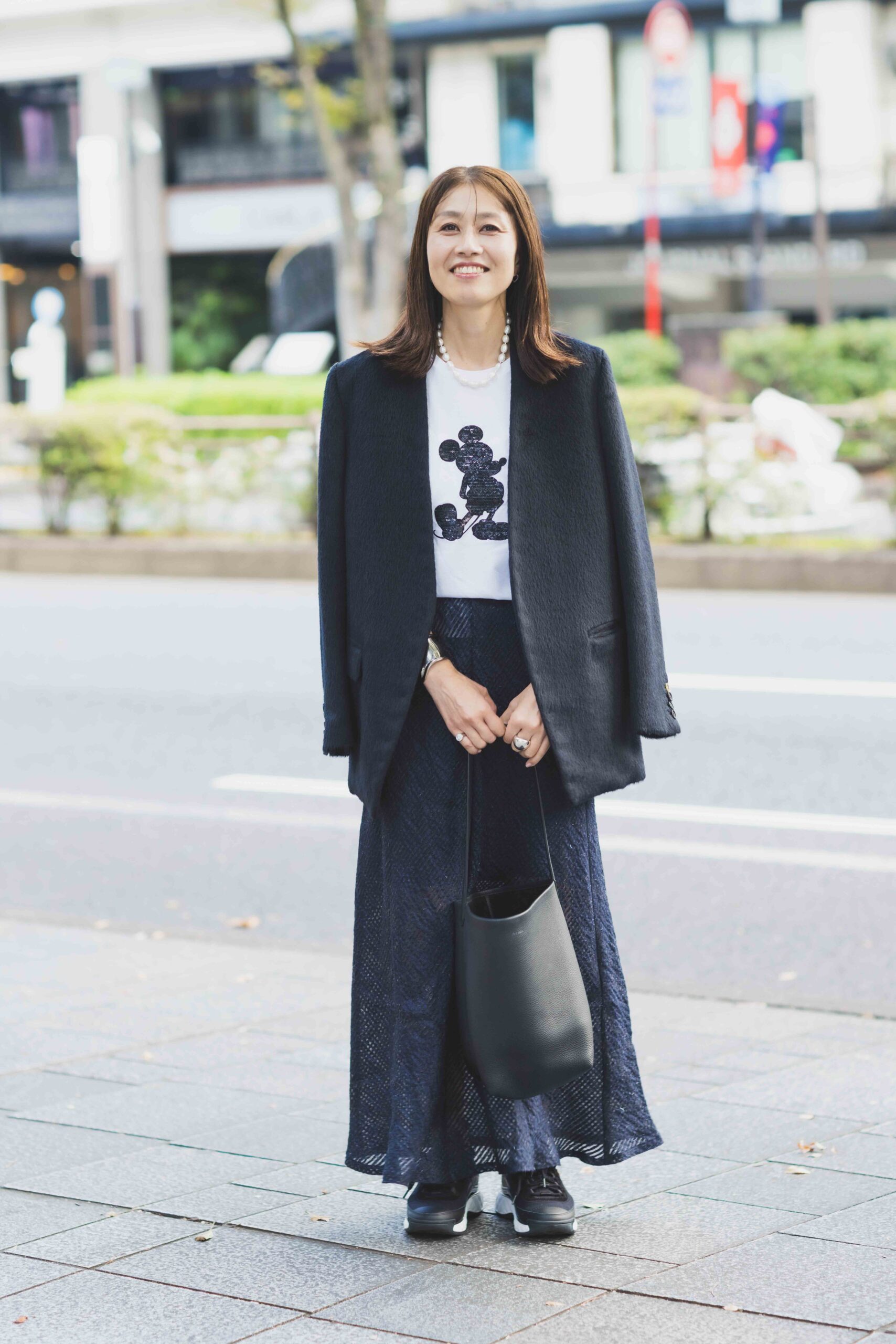 実はスニーカーは苦手なアイテム。ずっとキレイめの格好が好きで、カジュアルは似合わないと思っていたし、スニーカーを履いている自分も違和感がありました。でも、世の中のオシャレの流れはカジュアルブームで、大人もみんな履いてるスニーカーは憧れのアイテム。そんな私がスニーカーを克服できたのは、「必ずエレガントな要素を入れる」というマイルール発想から。今日はドゥーズィーエムクラスのシアースカートに、BRILLのジャケットでカジュアル過ぎない装いに。スニーカーもハイブランドのものをチョイスして、安心感を足しました。一目惚れしたミッキーのTシャツは実はメンズのもの。遊び心の中にシックなミーキーがお気に入りの一枚です。