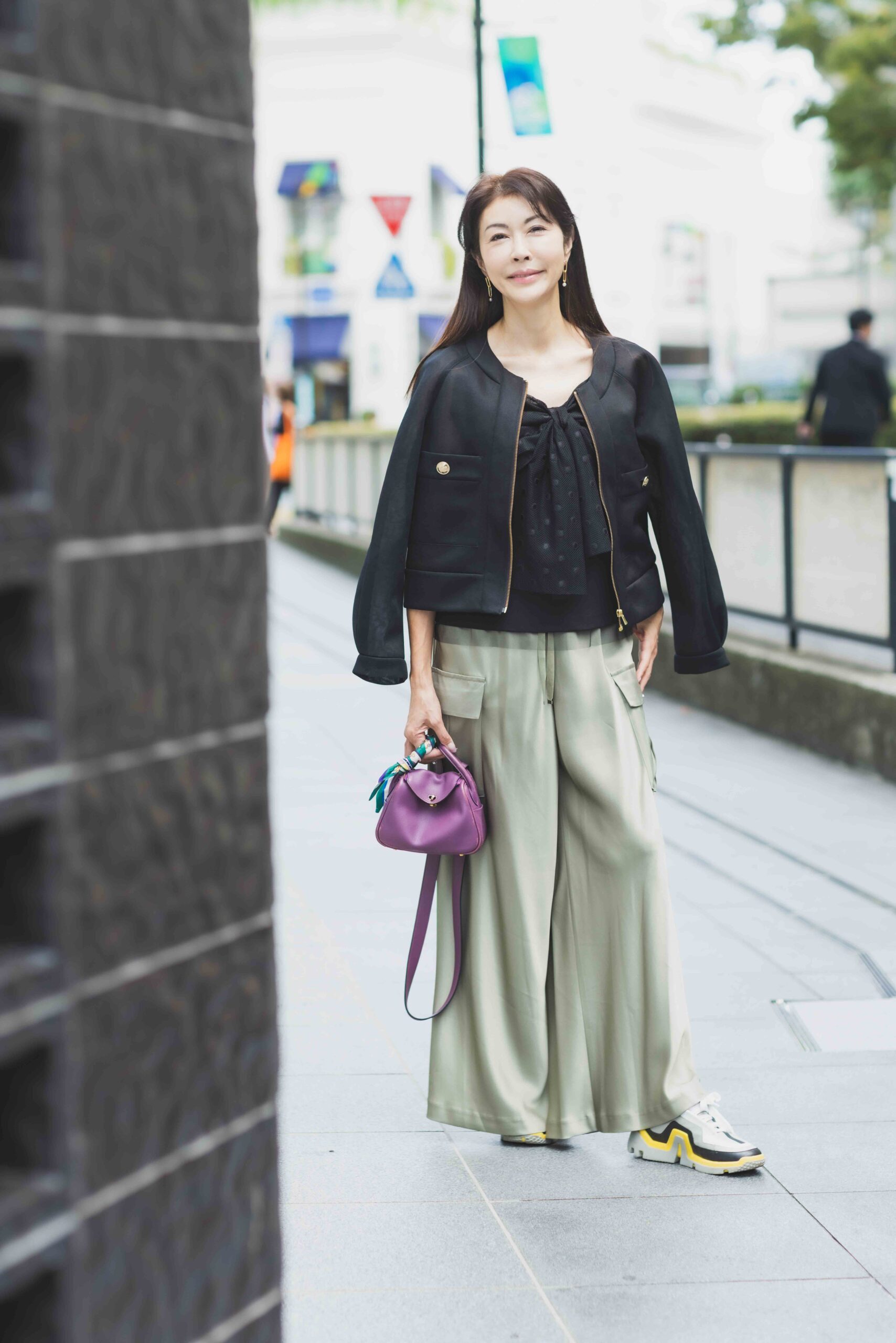 カジュアルになりすぎないように、光沢パンツやリボントップスなど、素材感やディテールで女らしさと品をラスしました。