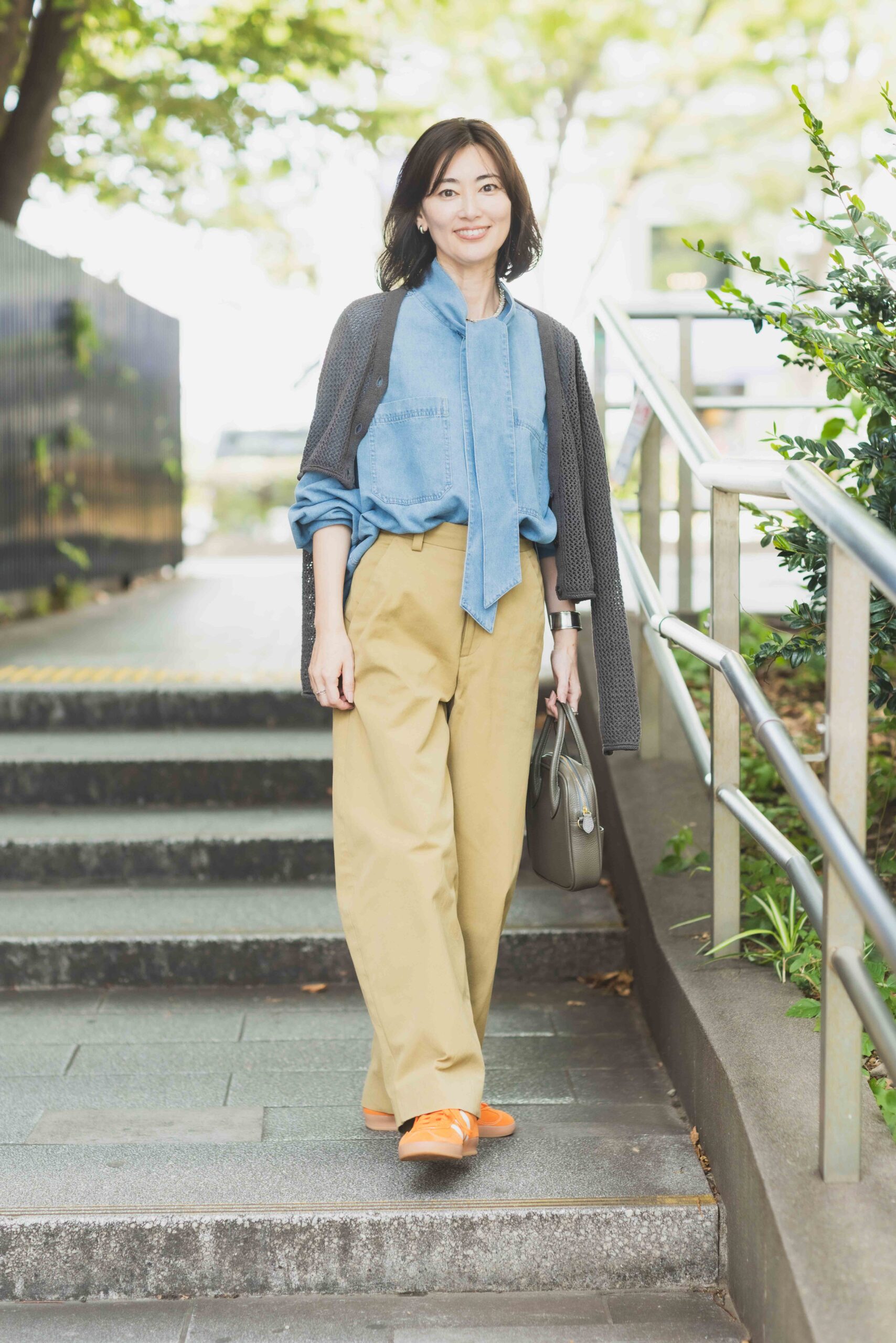 昨年、50歳を前にしてダンスを始めました。そんな自分を応援したくて、「背中を押してくれるアイテムを」と探していた時、出会ったのがオレンジのスニーカー。アディダスのガゼルです。私にしては、ちょっと冒険でしたが、履くたびに「よし、やるぞ!」という気合が入ります。実はオレンジって、ネイビー、ベージュ、ブラックと相性がよいので出番が多くなっています。今日は、デニムのボウタイブラウスにバレルレッグのチノパンツを合わせました。程よい華やかさがこのスニーカーにマッチ。 シルバーアクセに、バッグやカーデをグレーにして馴染むトーンに仕上げ