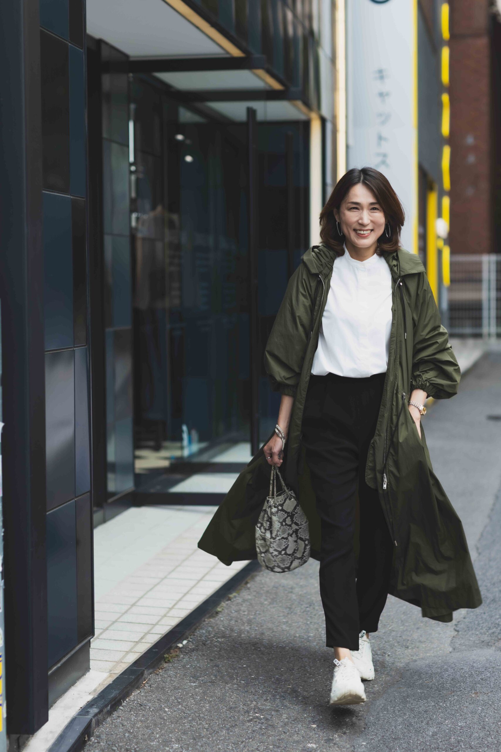 エンフォルドのパンツにCINOHのアウター、Demi-Luxe BEAMSのシャツなど好きなブランドは昔から変わらず、そこにパンプスではなくスニーカーを合わせて大人のカジュアルを楽しんでいます。ポイントは白のスニーカーで抜け感をプラスした、キレイめカジュアルを意識しています。街歩きからジム通いまでの万能コーデです。