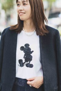 実はスニーカーは苦手なアイテム。ずっとキレイめの格好が好きで、カジュアルは似合わないと思っていたし、スニーカーを履いている自分も違和感がありました。でも、世の中のオシャレの流れはカジュアルブームで、大人もみんな履いてるスニーカーは憧れのアイテム。そんな私がスニーカーを克服できたのは、「必ずエレガントな要素を入れる」というマイルール発想から。今日はドゥーズィーエムクラスのシアースカートに、BRILLのジャケットでカジュアル過ぎない装いに。スニーカーもハイブランドのものをチョイスして、安心感を足しました。一目惚れしたミッキーのTシャツは実はメンズのもの。遊び心の中にシックなミーキーがお気に入りの一枚です。