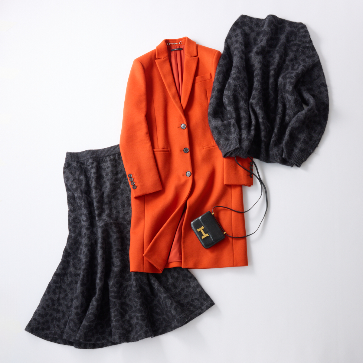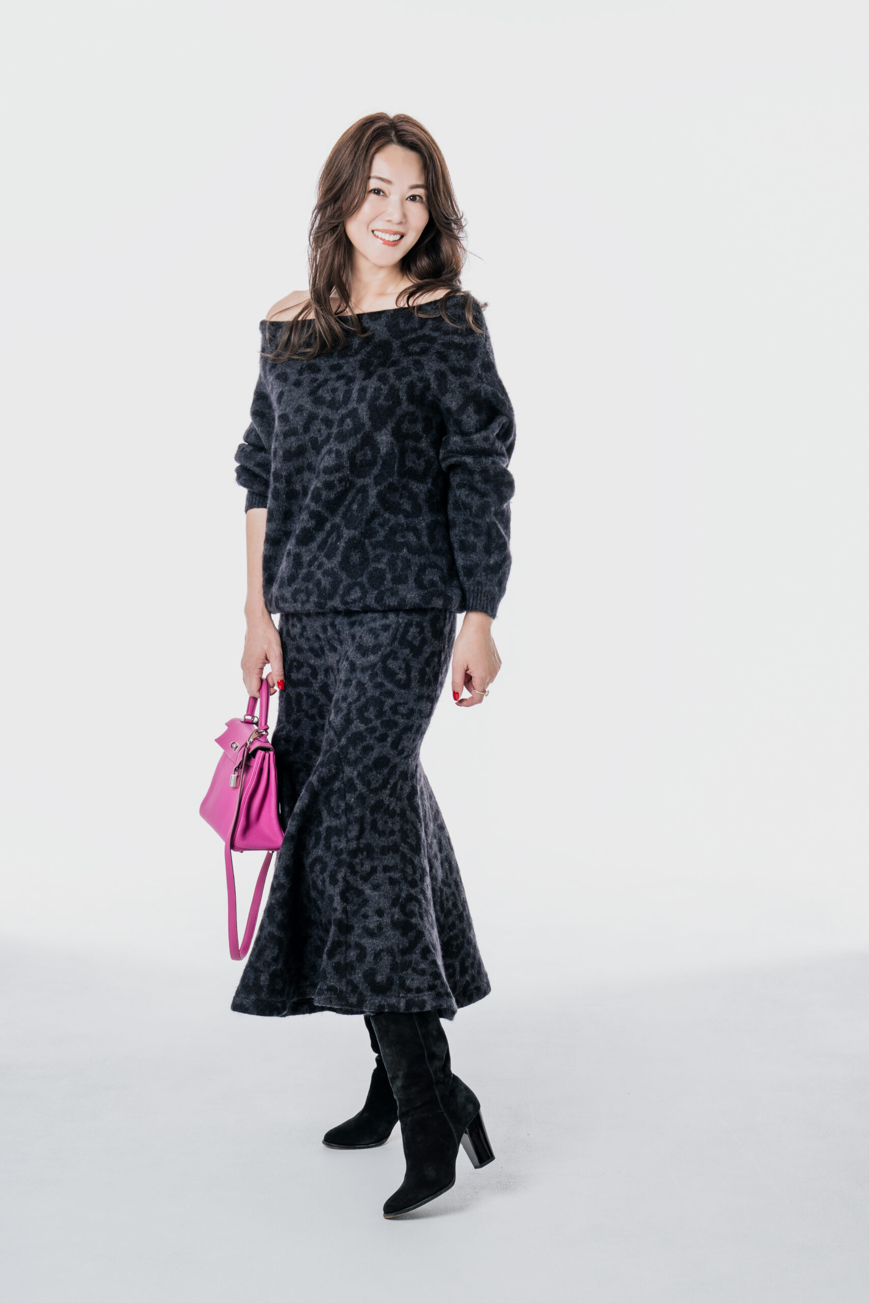 離婚する前、前夫とクリスマスプレゼントを買いにいった時に、たまたま入ったヴァレンチノで一目惚れしてしまったセットアップ。本当はバッグかアクセサリーを買いに行く予定だったのですが、あまりの可愛さに胸キュンしてこちらに決めたんです。それからは毎年着ている私の勝負服。豹柄なのに全くいやらしくなく上品に仕上がるのはさすがヴァレンチノです。気分によっては肩を見せたり、自由に肌見せを調節して楽しんでいます。服のトーンがシックなので、今日は明るいバッグを差し色にコーデしました。